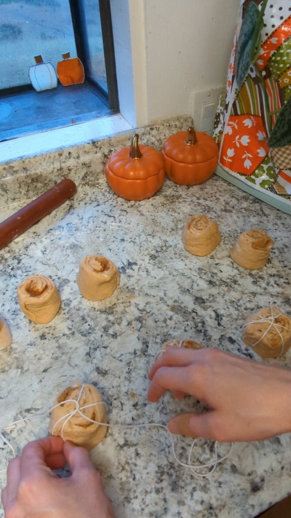 Cut 8 pieces of baker’s twine into approximately 14″ lengths. Tie around each roll to make a six sided pumpkin. Evenly space the rolls in a liberally greased sheet pan and once again cover with a damp towel for the second rise- 3 to 4 hours- until the rolls have risen about 1.5 times their size.