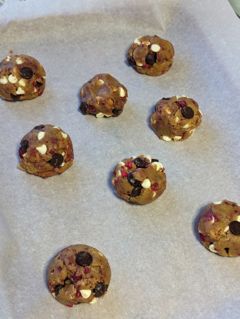 A classic browned butter chocolate chip cookie with pops of tart, freeze dried raspberries, with dark and white chips.